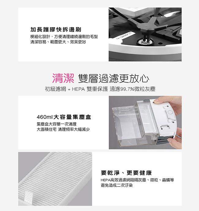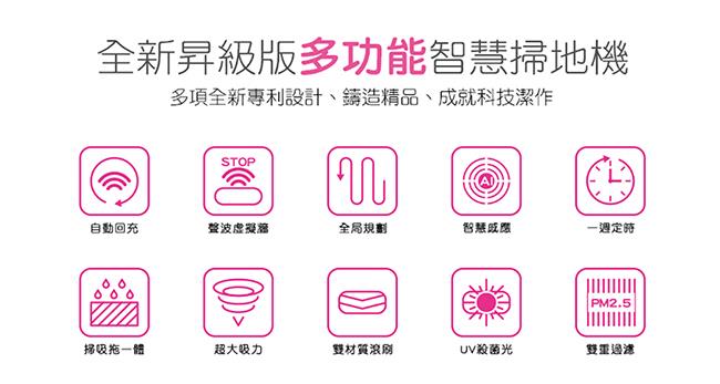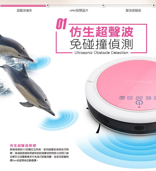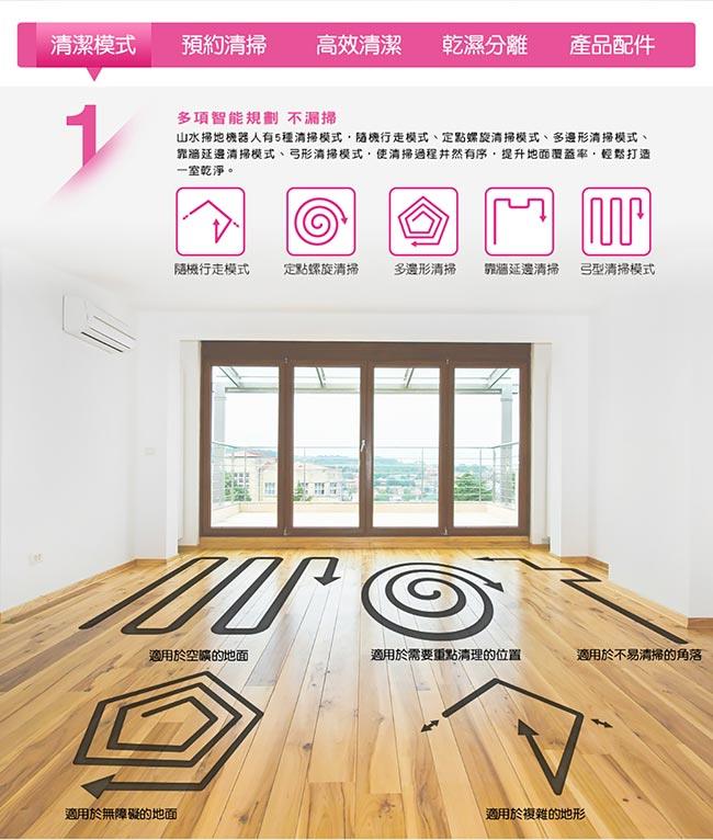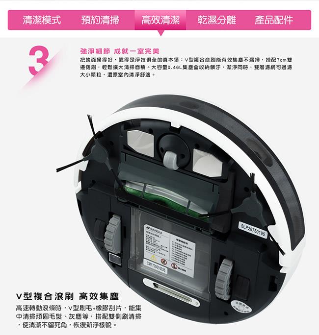 商品訊息簡述: 可預約定時清掃 高達5種清掃規劃模式仿生超聲波免碰撞偵測 浮動滾刷集塵 真空吸口 乾溼分離提升拖地效率 大面積UV殺菌燈 HEPA 過濾網 高效續航鋰電池 商品名稱 SANSUI